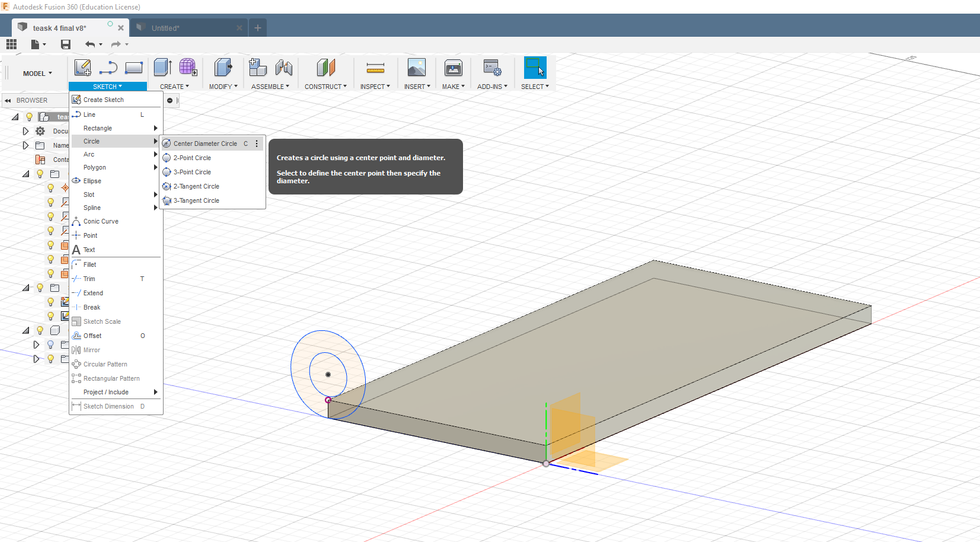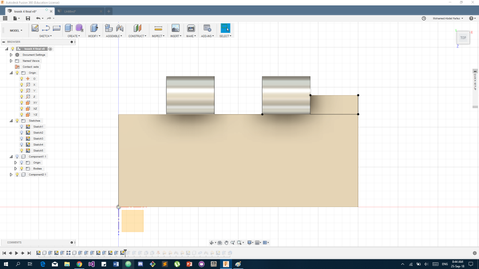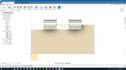 6. We will rotate the rectangle and select the side of it to draw two circles inside each other at the edge of the rectangle to create the joint (we will draw the circle by click on SKETCH in the toolbar then chose Circle then Center Diameter Circle or the short cut click C on the keyboard).